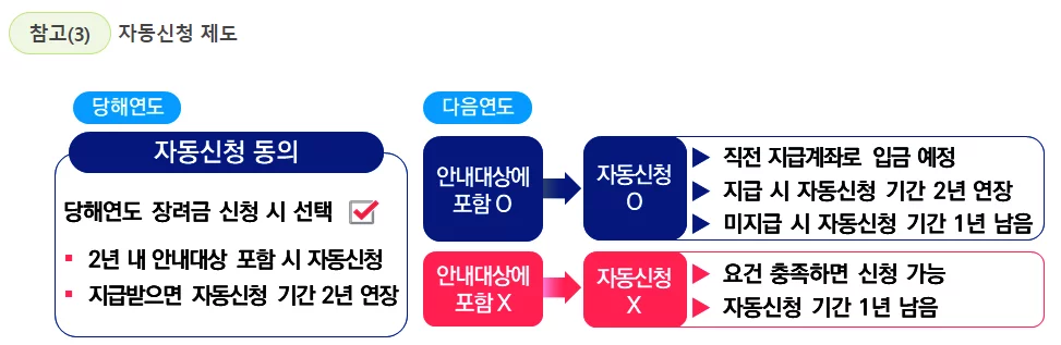 자동신청 제도: 60세이상 고령자 및 중증장애인이 장려금 신청기간에 동의하면, 향후 2년 내 신청안내 대상 포함 시 자동으로 신청