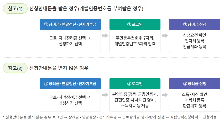 안내문 받은 경우 : 손택스 앱 실행 => 근로·자녀장려금 신청 => 주민등록번호 뒤 7자리와 개별인증번호 입력 => 연락처 / 계좌번호 확인 => 신청하기