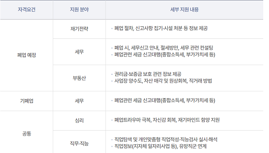 • 목적: 폐업으로 인한 경제적 어려움 극복 및 새로운 삶 준비 지원