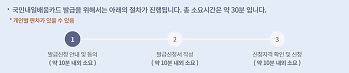 국민내일배움카드 발급을 위해서는 아래의 절차가 진행됩니다. 총 소요시간은 약 30분 입니다.