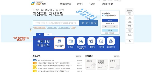 HRD - Net 홈페이지 로그인 후 나의 정보 펭이지에서 나의 카드 > 국민 내일배움카드>발급신청으로 이동하기